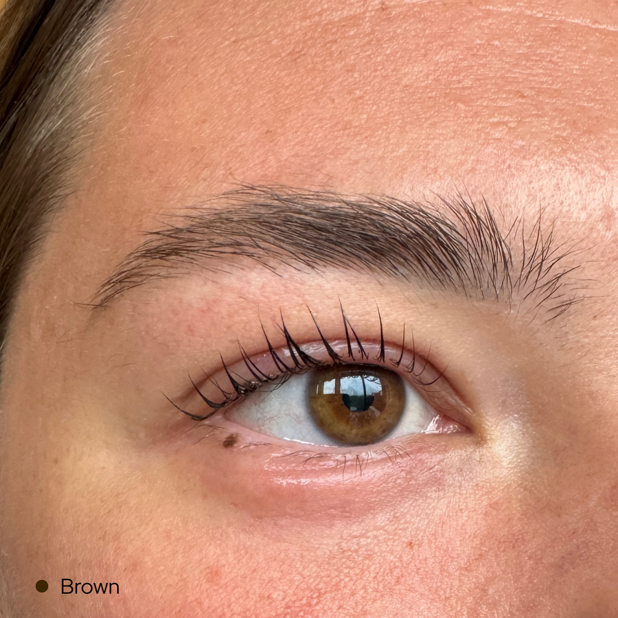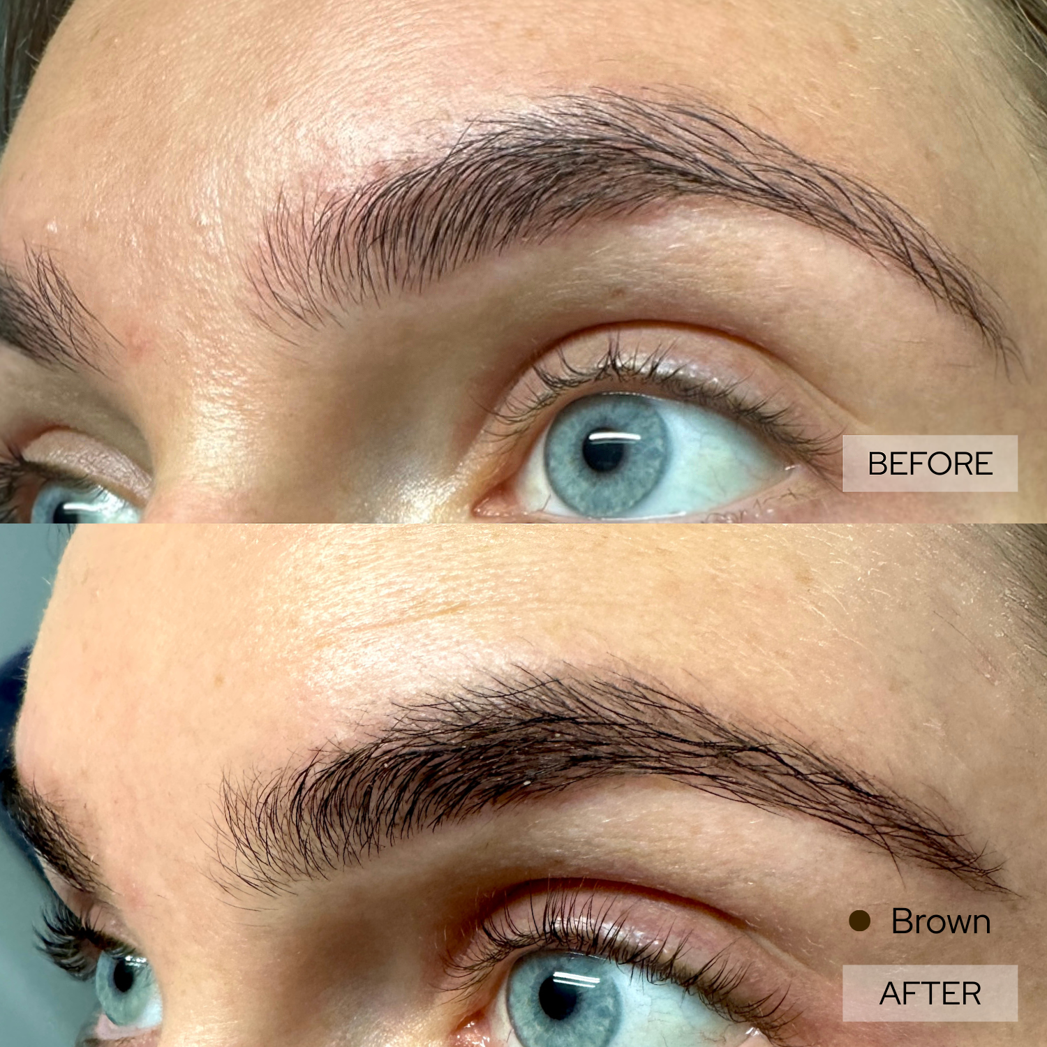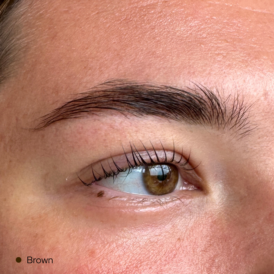 Most lash and brow tints still rely on ammonia or other harsh chemical developers to force pigment into the hair shaft. While effective, these can leave hairs feeling coarse, brittle, and more prone to damage over time.
